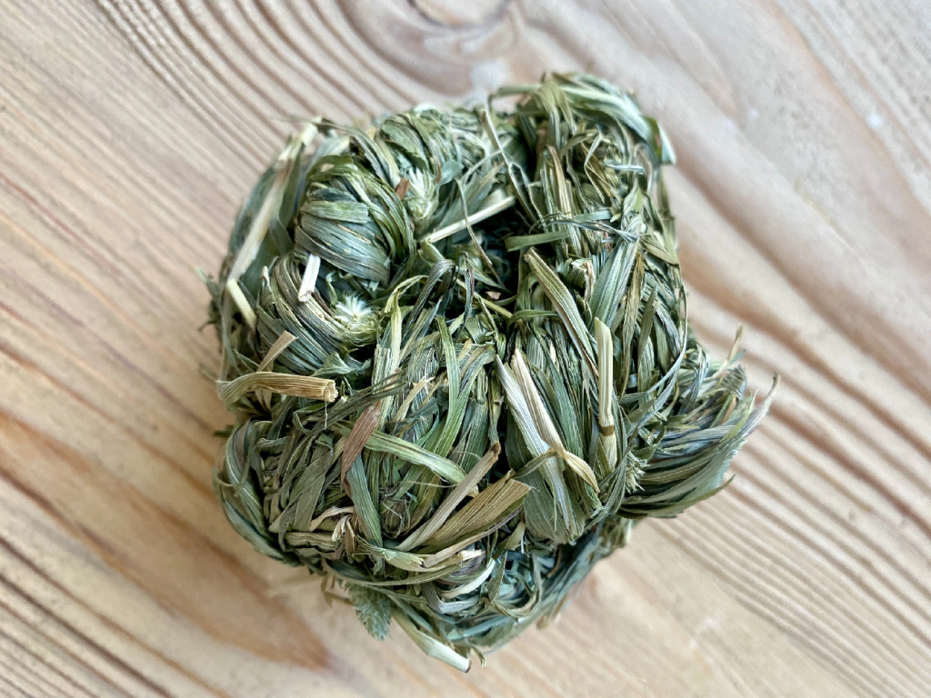 Míček je vyroben z kvalitního bojínkového sena bez přidaných barviv, obilovin nebo umělých přísad. Bojínek luční je přirozenou součástí jídelníčku mnoha drobných zvířat a je ceněn pro svůj přirozený obsah vlákniny, která je důležitou součástí vyvážené potravy.