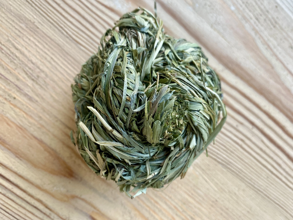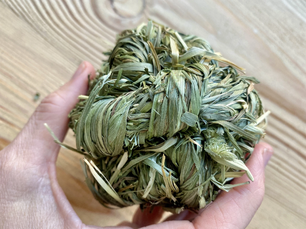 Zabavte své mazlíčky naší přírodní hračkou: míčkem z bojínkového sena. Ručně vyráběný míček může pomoci zpestřit jejich každodenní aktivity a zároveň poslouží jako chutné doplnění jídelníčku. Vhodný pro králíky, morčata i další drobná zvířata.